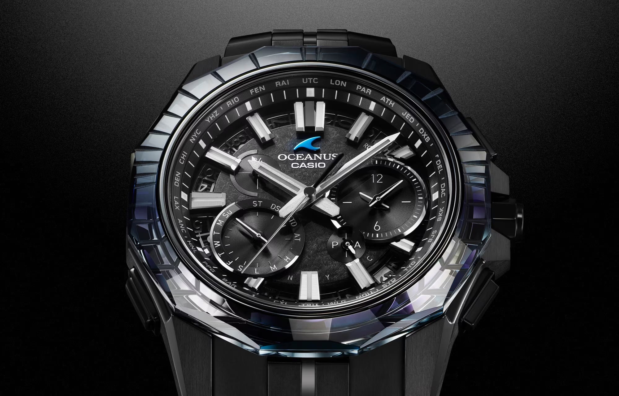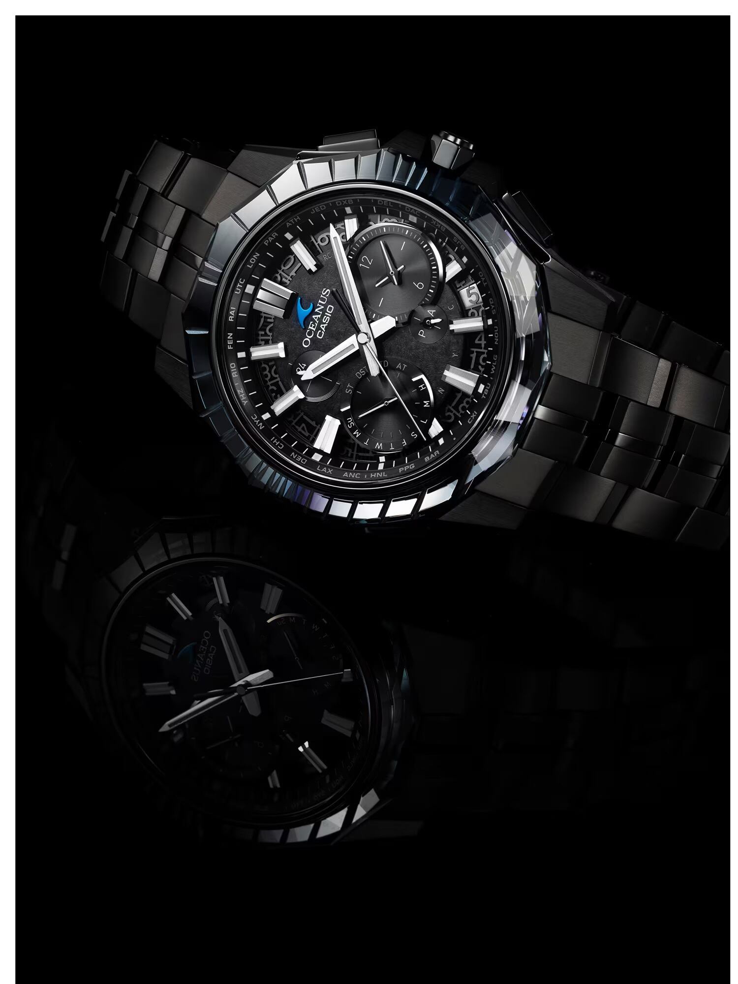 月の光に照らされた夜の海を、DLC処理したチタン外装と江戸切子のサファイアガラスベゼルで表現しました。