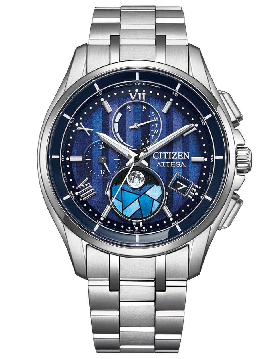 月齢自動計算機能「ルナプログラム」搭載モデルを限定仕様にアレンジ。デュラテクトプラチナのケースとバンドが、荘厳で神聖な印象を醸し出します。縦のブルーグラデーションで教会に降り注ぐさまざまな光を描いた文字板に、ローマ数字とバーインデックスを組み合わせたエレガントなデザインです。ムーンフェイズの月齢板を覆うエリアには半透明の印刷を施した白蝶貝を使い、美しく光るステンドグラスを表現。まるでステンドグラス越しの夜空を見上げるように、今宵の月の満ち欠けを確認できます。