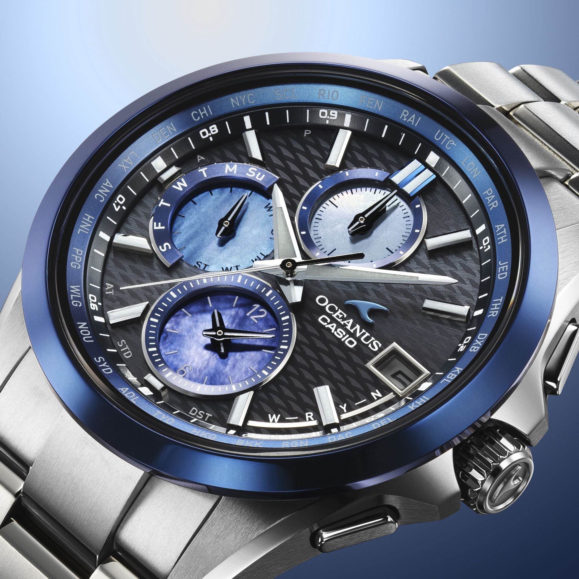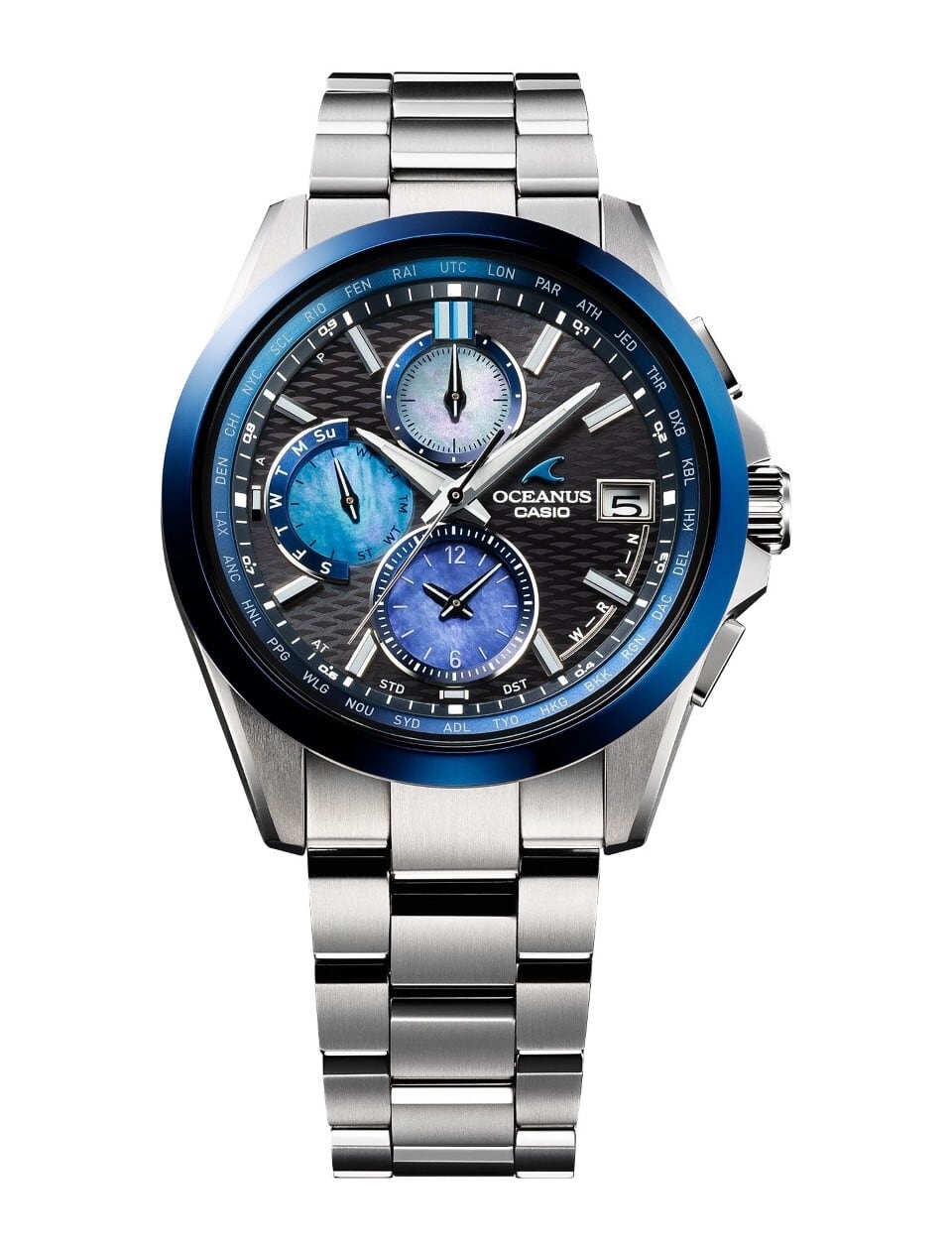 上質な仕上げと薄型フォルムを追求するOCEANUSより、白蝶貝の柔らかな光沢を基調に徳島県産の天然藍「阿波藍」で重なり合う濃淡を表現したモデルです。